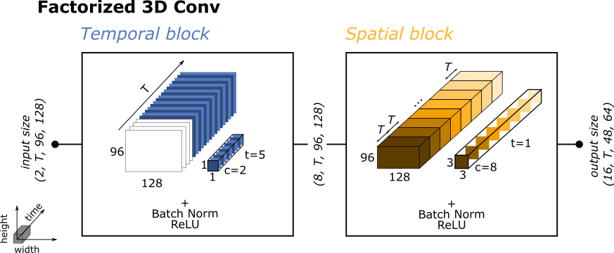 Our spatiotemporal blocks perform temporal convolutions first, followed by spatial convolutions. Decomposing the 3D convolutions into temporal and spatial layers greatly reduces computation (in much the same way that depthwise separable layers do for 2D convolutions).