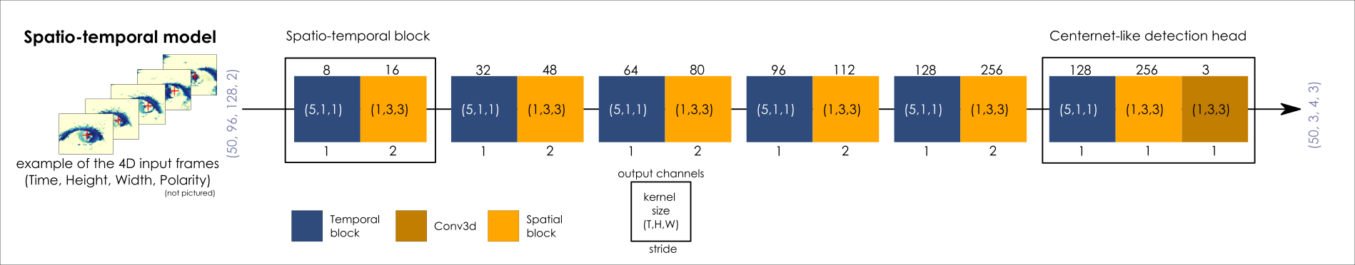 The proposed architecture is a stack of spatiotemporal convolutional blocks, each consisting of a temporal convolution followed by a spatial convolution. These are designed to extract both fine-grained temporal features and local spatial structure from event-based input tensors. The figure below shows the details of the model architecture.