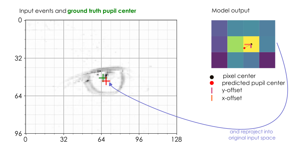 A lightweight head, inspired by CenterNet Zhou et al. 2019, predicts a confidence score and local spatial offsets for the pupil position over a coarse spatial grid. The predicted position of the pupil can then be reconstructed.